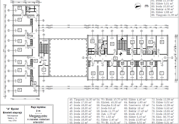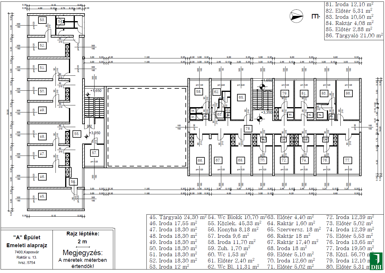 Kiadásra kínálunk Kaposvár frekventált részén a Raktár utcában egy 491,4 négyzetméteres (Az alaprajzon 45-78-ig jelölt helyiségek) 1. emeleti irodát.